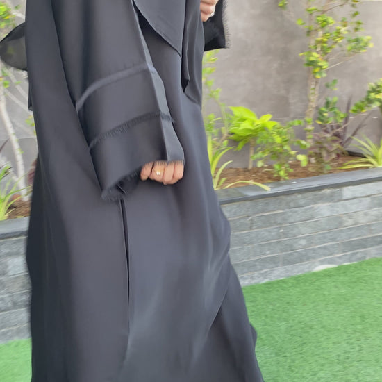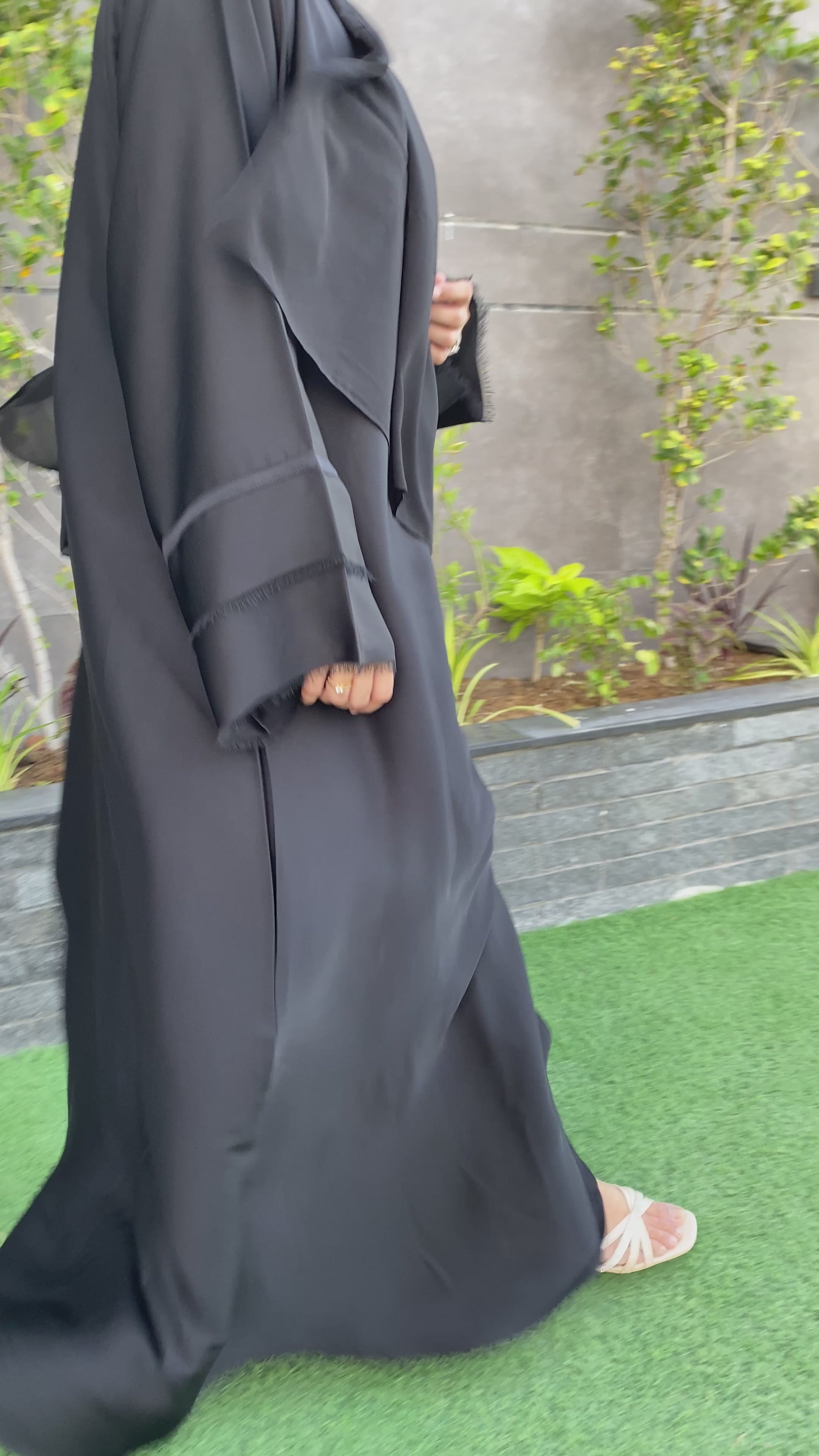 This Classic black abaya is made with premium nadah fabric with boho inspired shredded sleeves. this abaya comes with a matching shayla made in Duja Al Lail Chiffon.